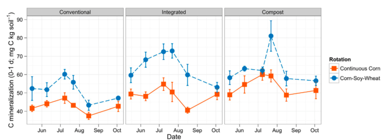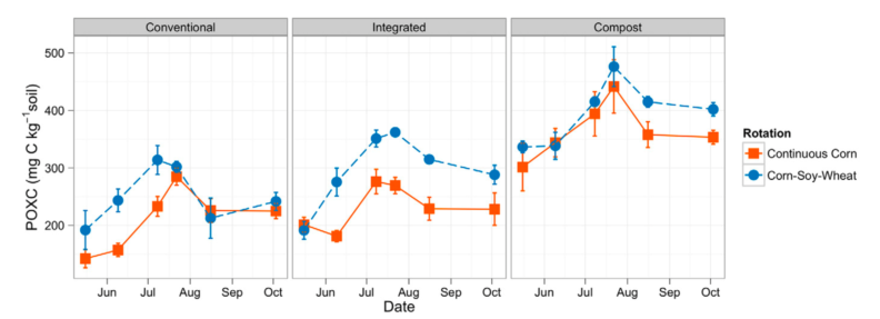 Figure 3. From Culman et al., 2013, showing seasonal dynamics of active C and treatment differences between rotations (continuous corn vs. corn-soy-wheat) and fertility practices (“conventional” vs. “integrated” vs. “compost”)